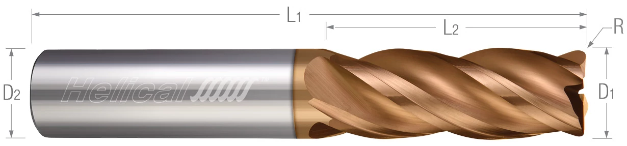 Corner radius profile end mill designed to extend tool life in stainless steels, high temp alloys, and hardened steels up to 65 Rc, and engineered with eccentric relief for maximum edge strength in both roughing and finishing applications.